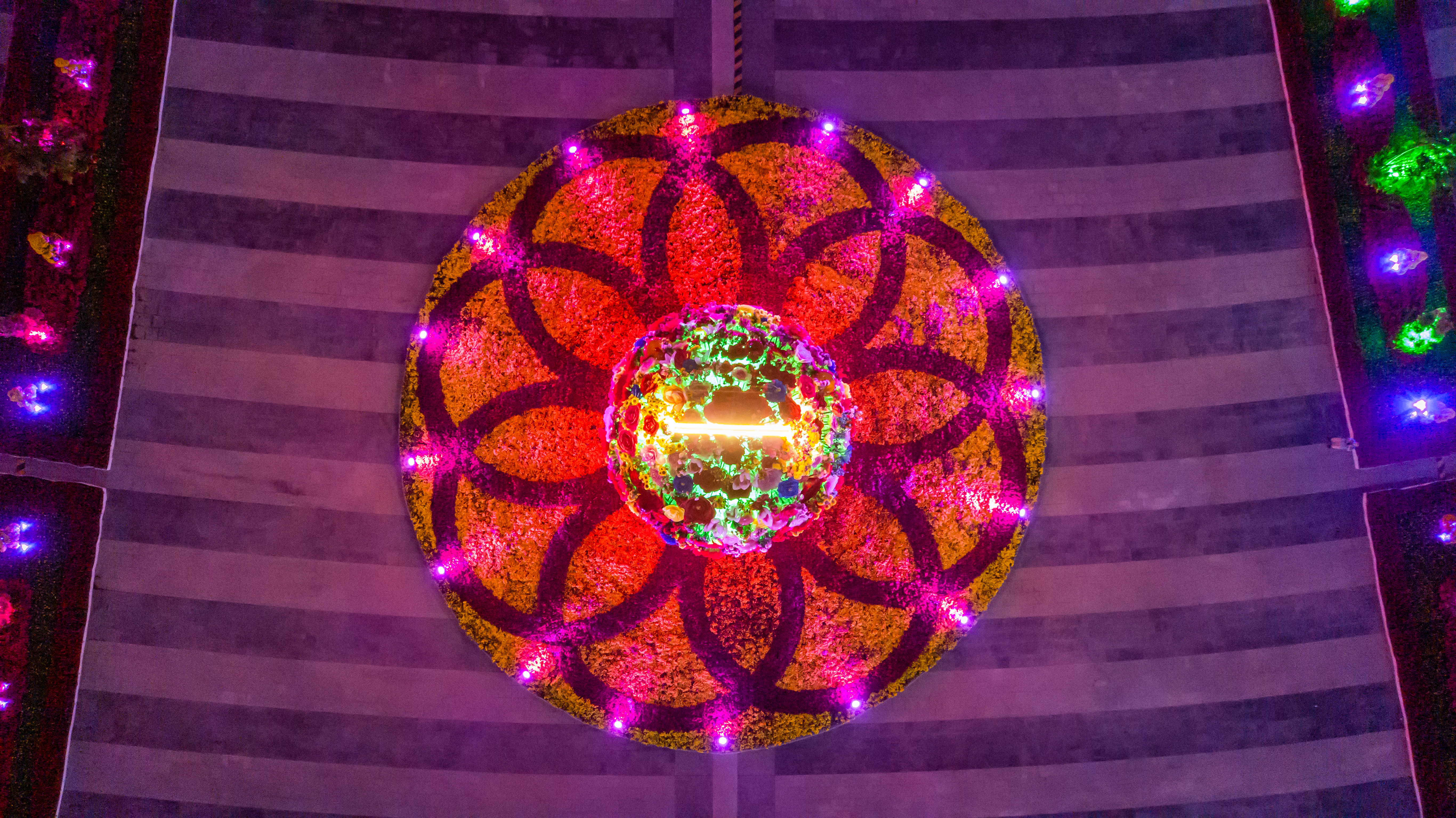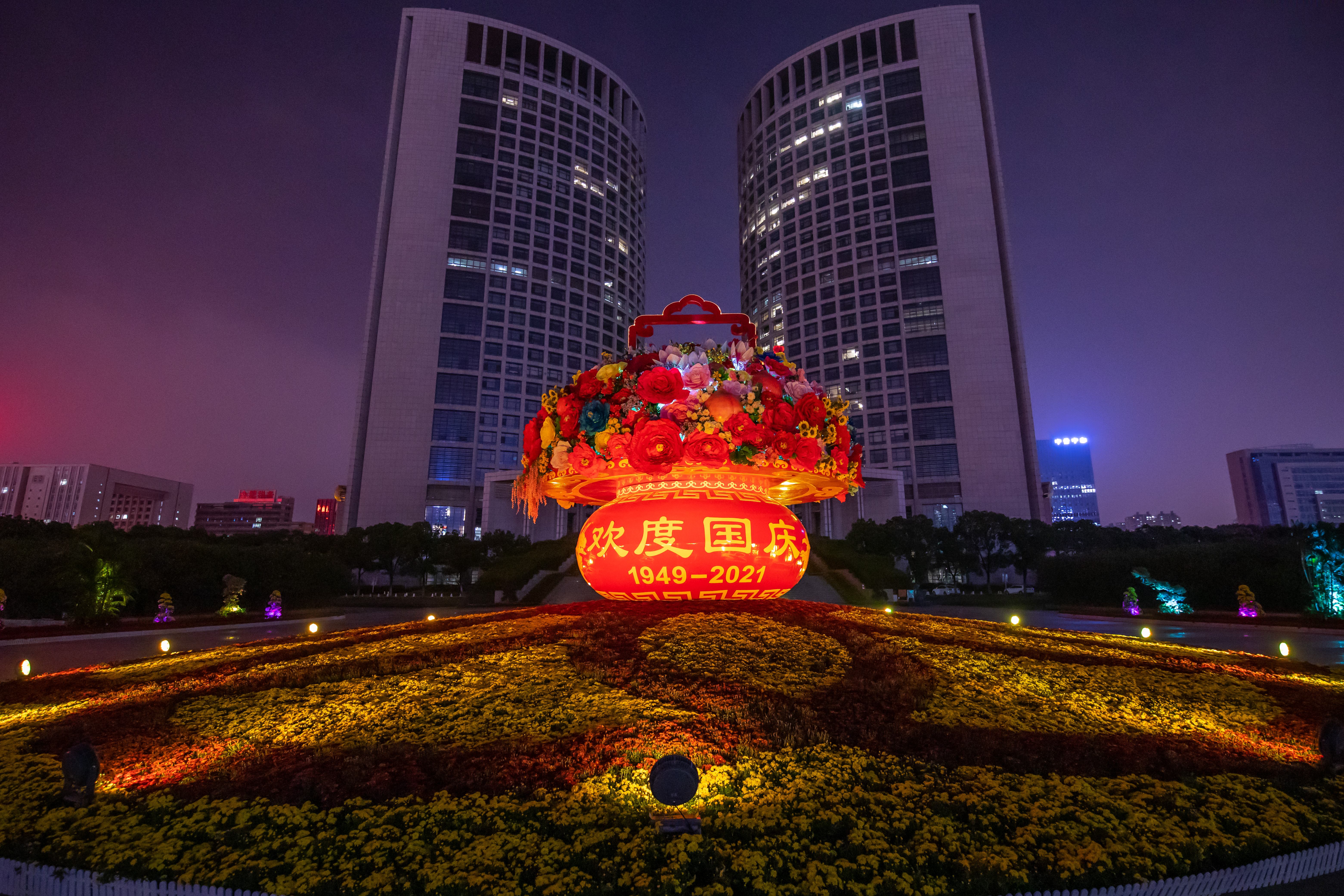 鮮花、綠植和仿真花卉姹紫嫣紅,組成的“巨型花籃”扮靚廣場,夜幕中的花籃在燈光的映射下色彩多變、美輪美奐,吸引眾多市民駐足拍照觀賞。