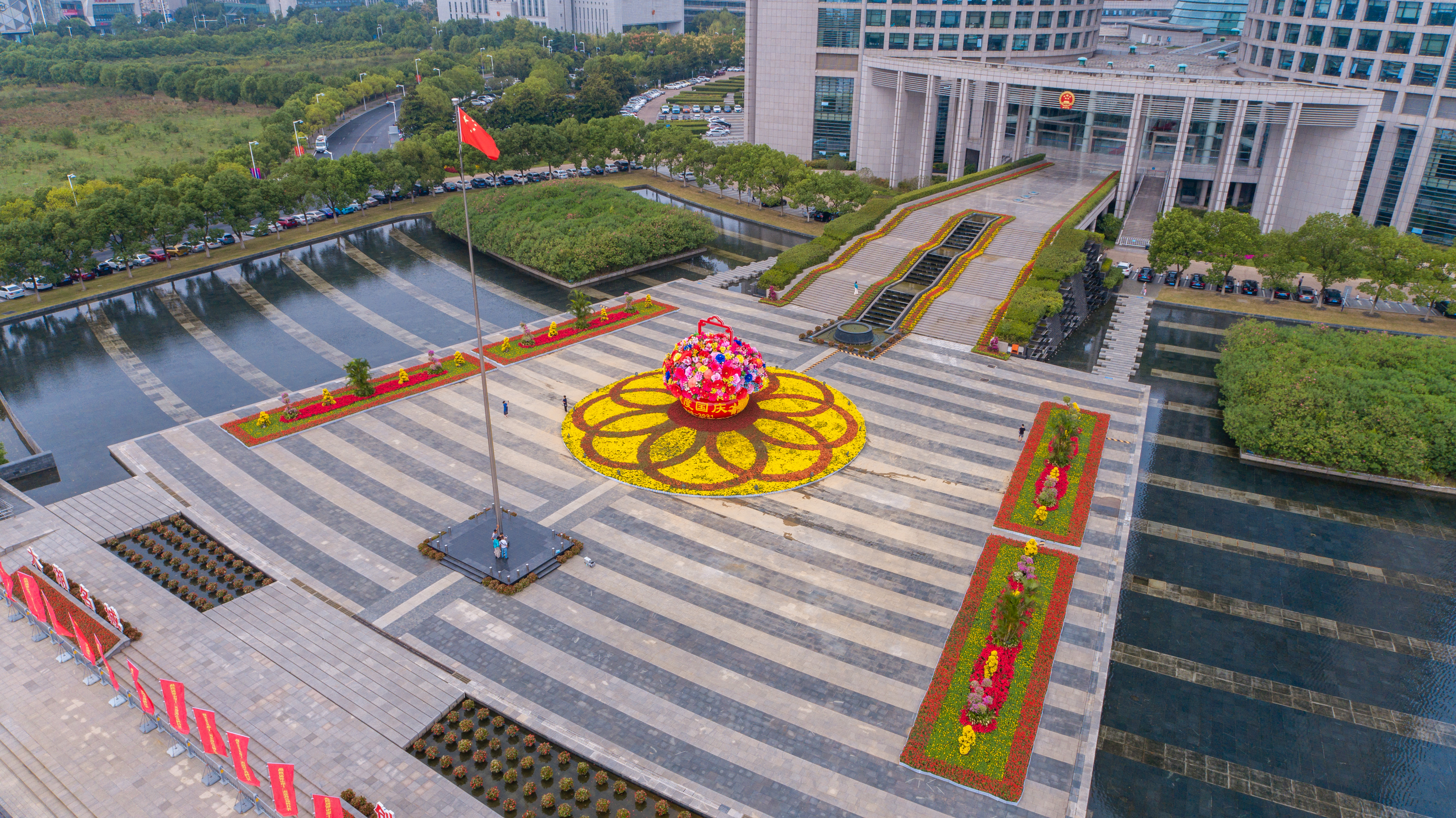 合肥市政務中心廣場打造的國慶主題花境以花籃為造型,獻禮祖國。使用向日葵、映山紅、紅梅、牡丹、康乃馨等仿真花卉,通過插花技藝,形成百花簇擁的景觀,四周用一品紅等時令花卉有序擺放組成圓形,襯托出節(jié)日的喜慶氛圍,祝福祖國繁榮昌盛。