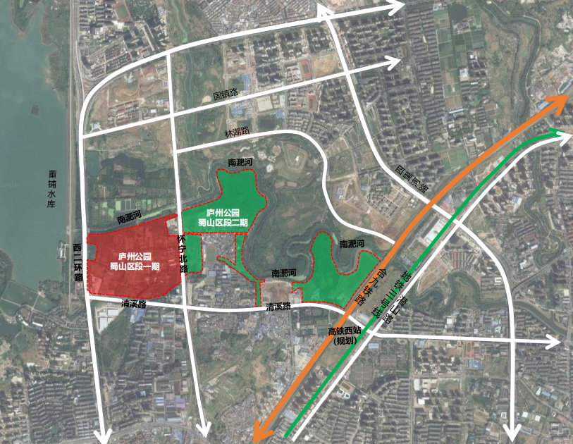 廬州公園蜀山段一期為懷寧北路以西地塊,即原市苗圃范圍,設計面積約39.9公頃(598.5畝),廬州公園蜀山段原市苗圃地塊設計范圍為南淝河以南,清溪路以北,西二環以東,懷寧北路以西的區域,總面積39.9 公頃(598.5畝)。一期周邊分布著綠泉園林(1.1公頃)、司法廳(1.2公頃)、奧宇科技(億博學校0.5公頃)、公交停保場(1.2公頃)等用地。
