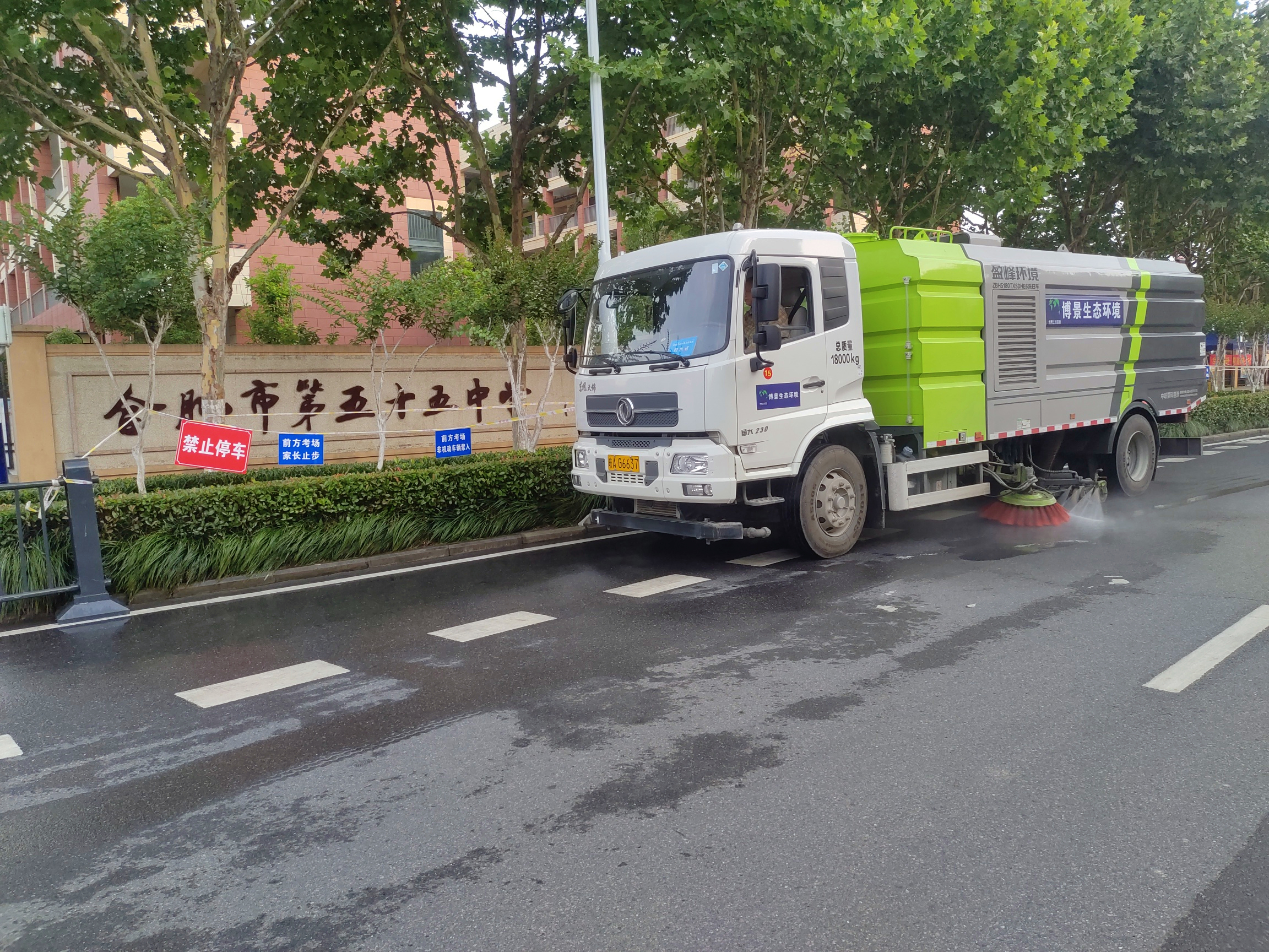 為確保考點周邊的環境清潔安靜,環衛作業高效、高質、高量地開展,博景生態環境安排水車及機掃車對考點周邊進行提前作業,避開考試時間,實行錯峰清潔,保證在考生到達考點之前完成學校周邊的道路清洗。