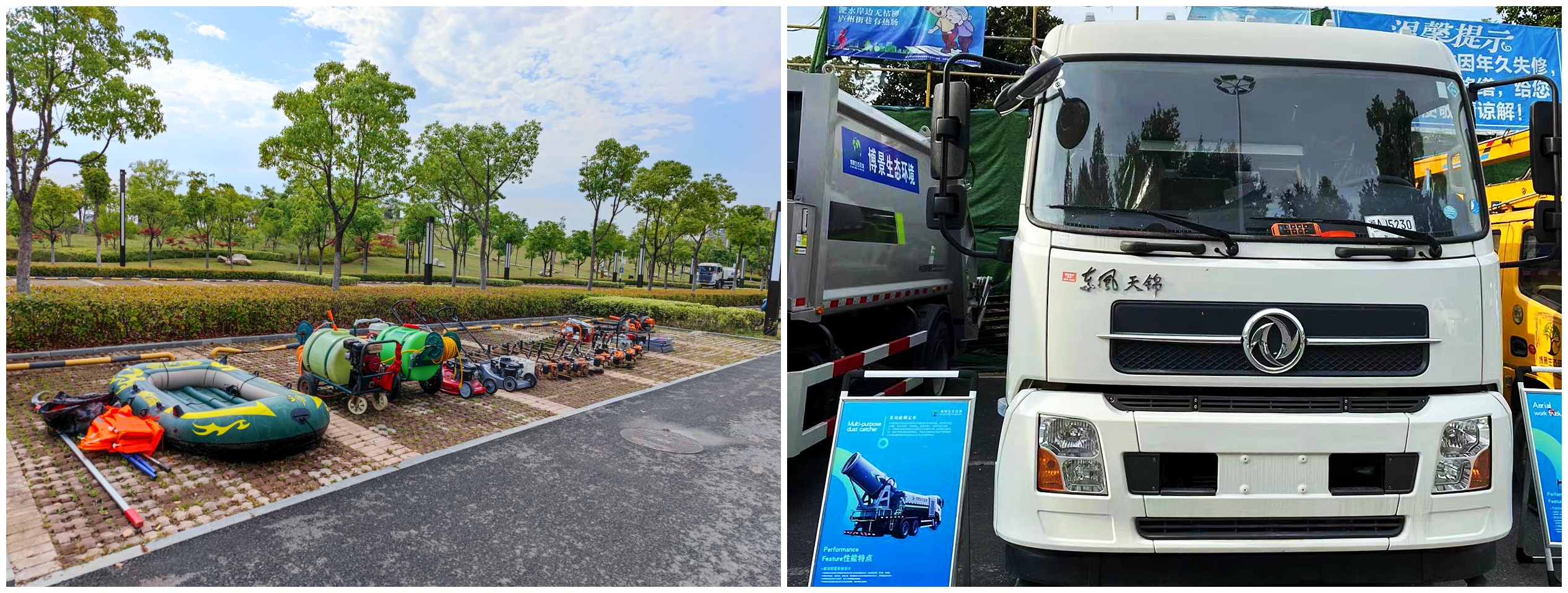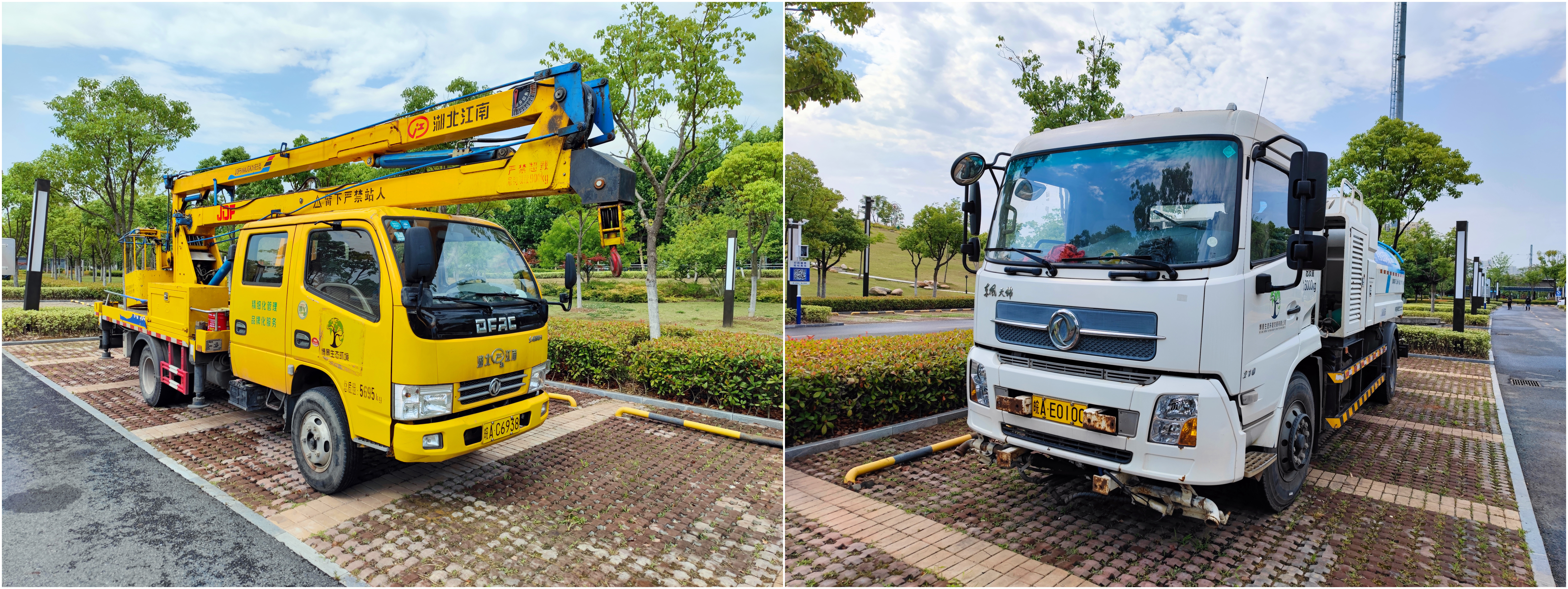 灑水車1輛、登高車1輛、多功能抑塵車1輛、貨車2輛、皮卡車1輛;推草機2臺、割灌機10臺、手推式打藥機2臺、手推式打藥機2臺、裝載式打藥機2臺、鼓風機(樹木除雪設備)5臺、無人機1臺。