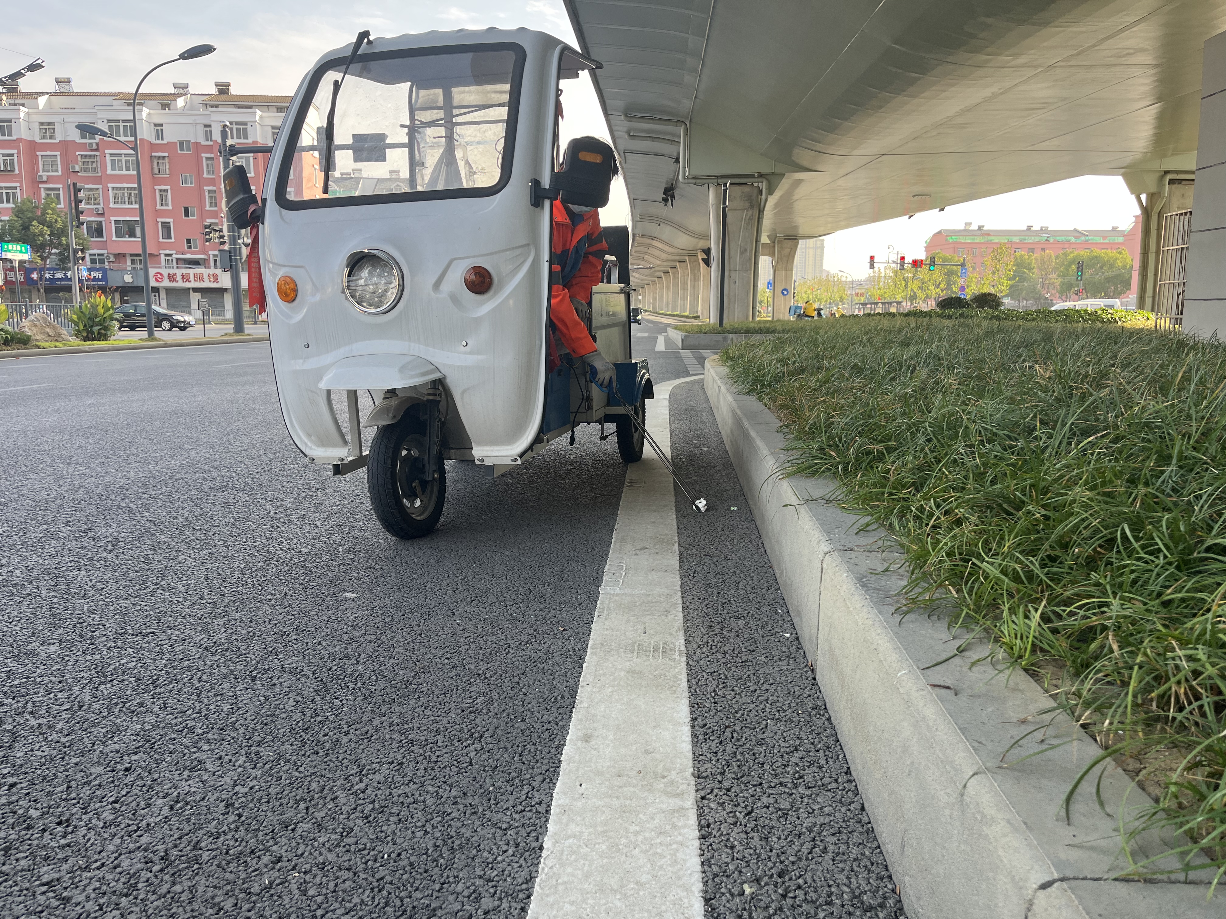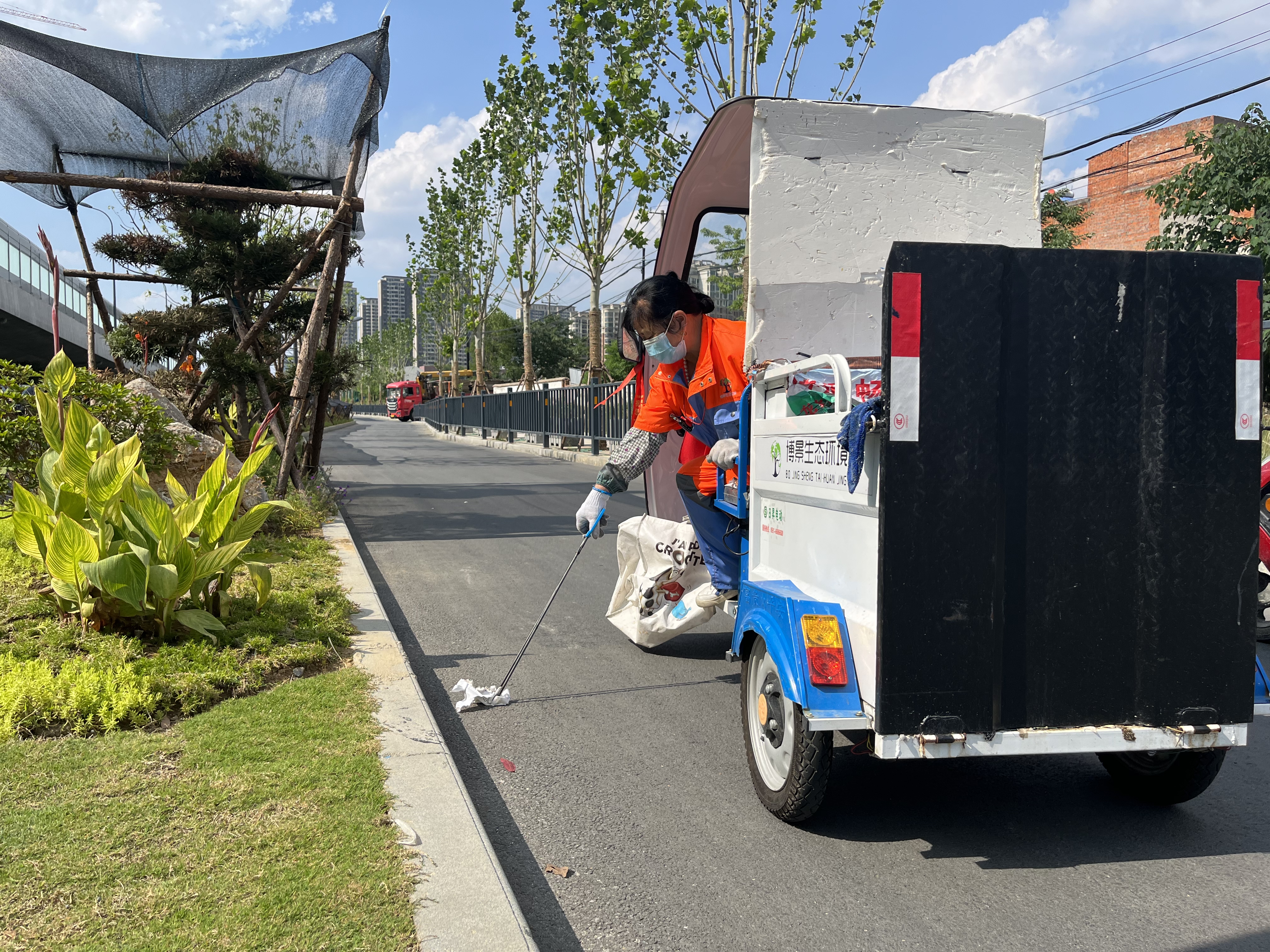 針對市一級道路周邊人流車流較大且較為容易產生垃圾的情況,龍崗項目對市一級道路增派保潔人員,增加電動三輪車飛行保潔循環式作業方式,以達到快速進行快車道與輔道的漂浮清理工作。做到"隨丟隨撿、隨撿隨凈"。縮短垃圾留地時間,提高保潔效率,提升保潔服務質量,確保道路周邊無煙蒂無漂浮物,營造潔凈有序環境。