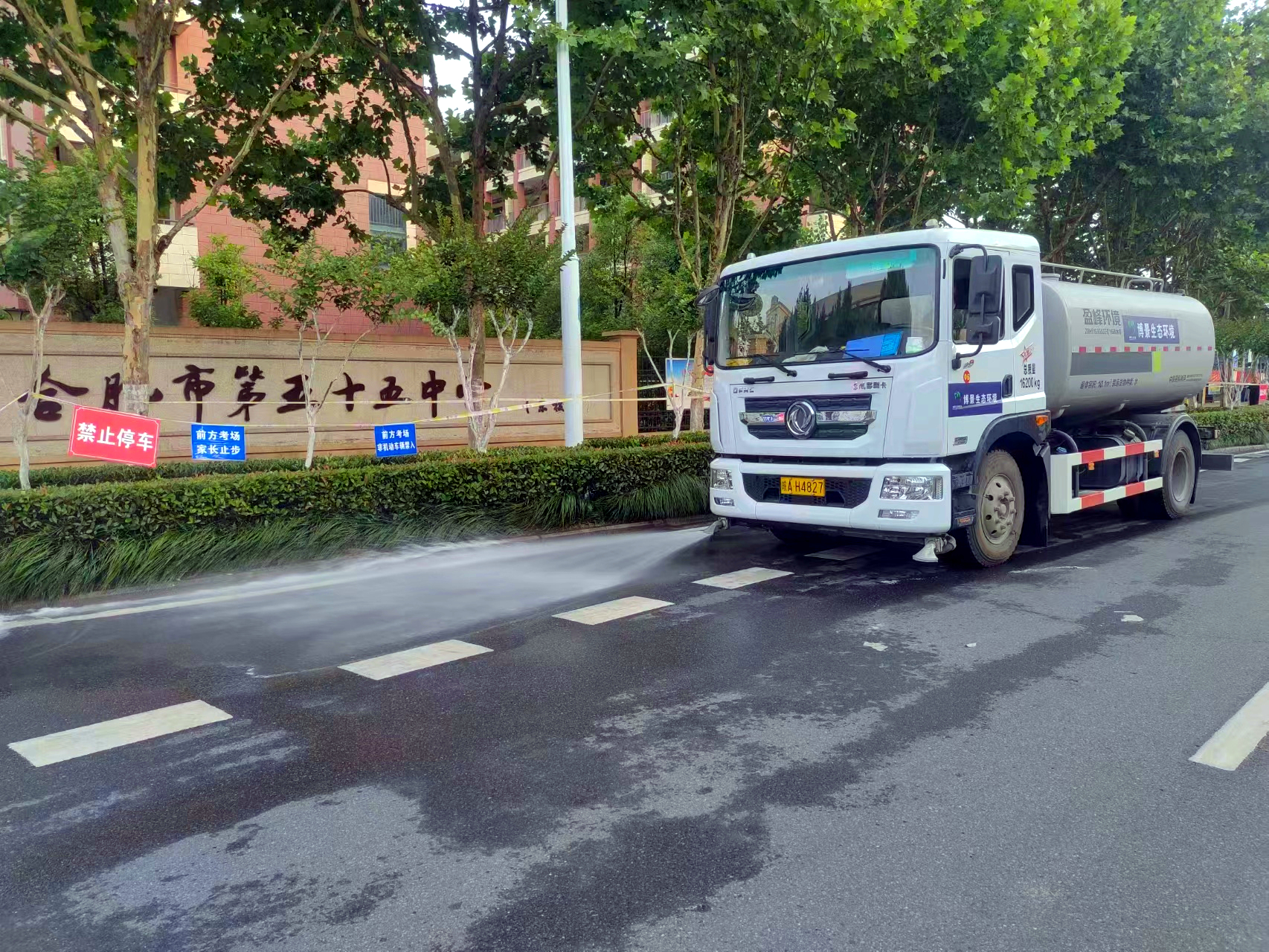 為確保考試場四周的清靜,博景環衛隊24小時打開“靜音”方式:統一關掉提醒工作中音,禁止鳴笛,多方位降塵減溫,人力取代機械工作降低噪音。務求為各位考生提供一個清靜、清爽、舒心的測試自然環境,保證考試場周圍環境“凈又靜”。
