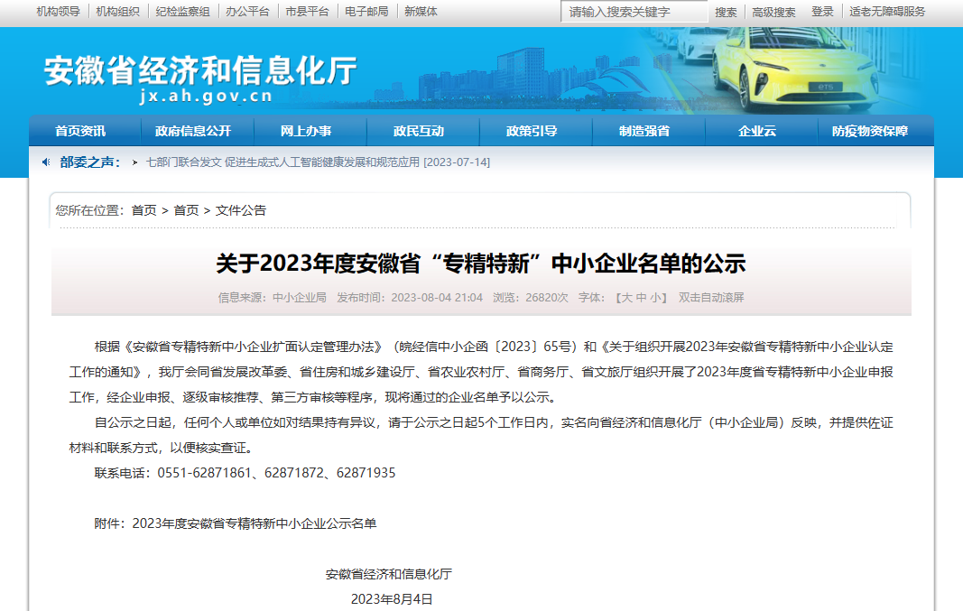 8月4日,安徽省經濟和信息化廳公示了2023年度安徽省“專精特新”中小企業名單,博景生態環境股份有限公司脫穎而出,榮獲2023年度“安徽省專精特新中小企業”稱號。